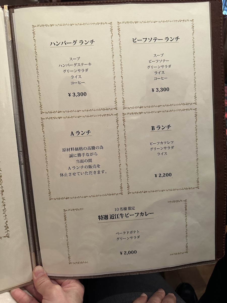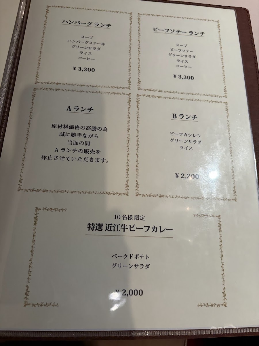 At Kuishinbo Yamanaka, the menu is a careful balance of hearty flavors and refined presentation, highlighting both classic and unique Japanese-style Western dishes. The ハンバーグランチ-ハンバーグステーキ impresses with its juicy, perfectly seasoned patty, often accompanied by a side of じゃがバター, whose rich, buttery texture complements the main course beautifully. The ビーフソテー delivers tender, flavorful slices of beef that melt in the mouth, while the comforting コーンスープ adds a smooth, subtly sweet counterpoint to the richer dishes. For those seeking a more indulgent experience, the 繋近江牛ロースうす焼き showcases premium Wagyu in delicate, thin slices, elegantly prepared to highlight the meat’s natural marbling. The 和風ステーキセット サラダ and 和風ステーキセット デザート offer a full dining experience, with fresh, crisp greens and a delicate sweet finish that round out the meal. Crispy yet tender, the ビーフカツレツ demonstrates careful attention to texture and seasoning, while the 限定のカレー brings a unique, savory warmth that stands out among the menu offerings. No meal is complete without the simple pleasures of コーヒー or the refreshing sweetness of メロンケーキ, which provides a light, fruity conclusion. Overall, the menu at Kuishinbo Yamanaka blends comfort and sophistication, giving diners a satisfying range of flavors that honor both the ingredients and the craft of preparation, making each dish memorable in its own right.